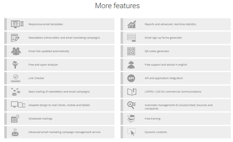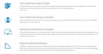Acrela News ist ein E-Mail-Marketingtool, welches jedem User ermöglicht, für sein Unternehmen effizientes E-Mail-Marketing zu betreiben. Die Server von Acrelia News befinden sich in Europa, sodass die spanischen Datenschutzbestimmungen gelten. Entscheidet sich der Interessent, das Tool für seine Zwecke zu verwenden, erhält er immer eine Kontaktliste mit aktuellen Informationen. Unsubscribe Anfragen sowie Spamberichte laufen automatisch über die Server. Ebenfalls verhindert das Tool, dass die Mails an doppelte Kontakte gesendet und inkorrekte sowie nicht vorhandene Kontakte automatisch aus der Kontaktliste gelöscht werden.